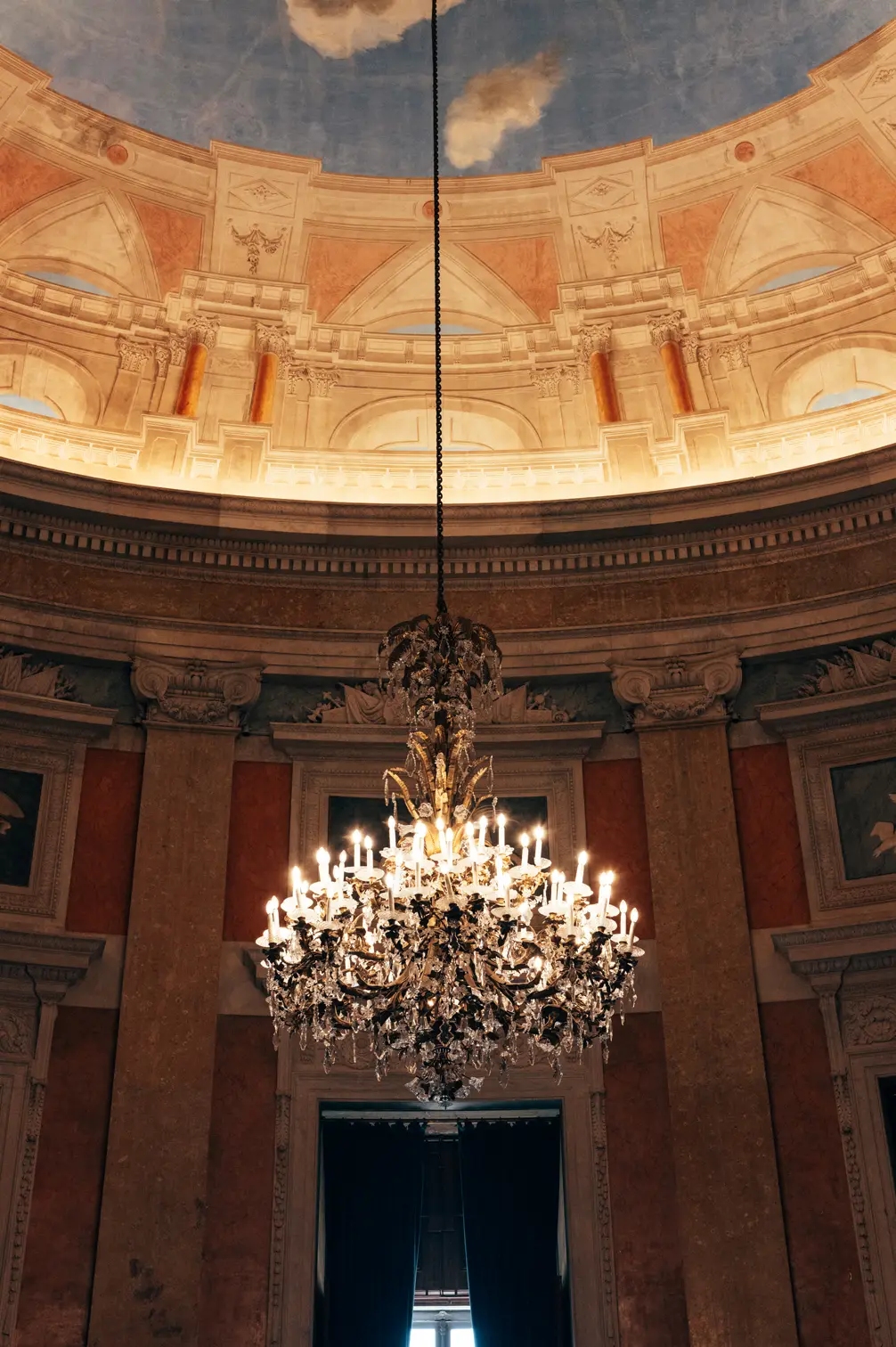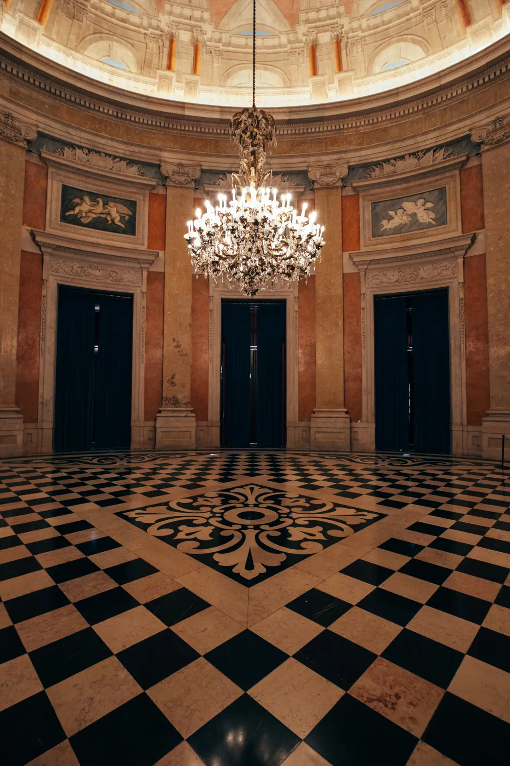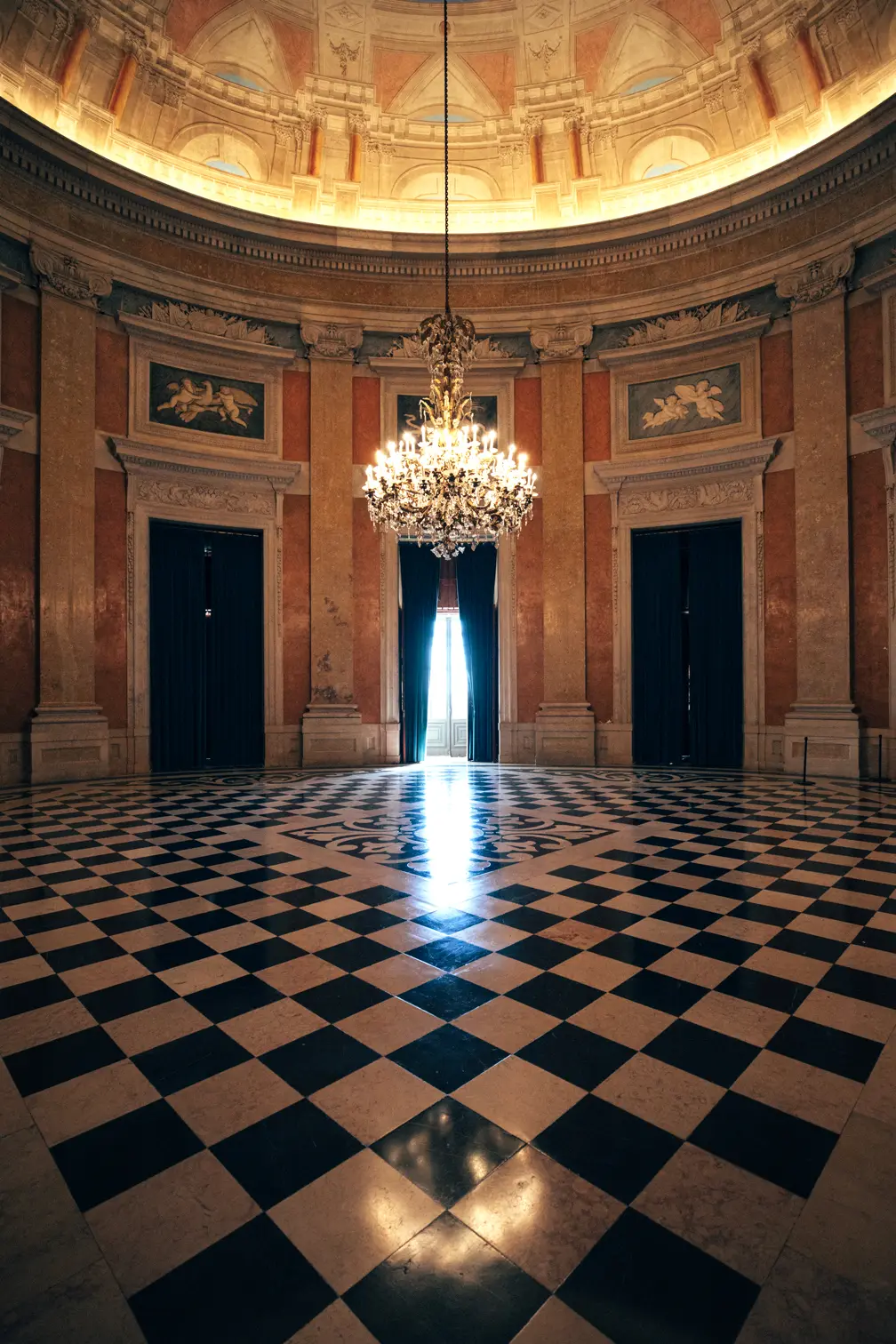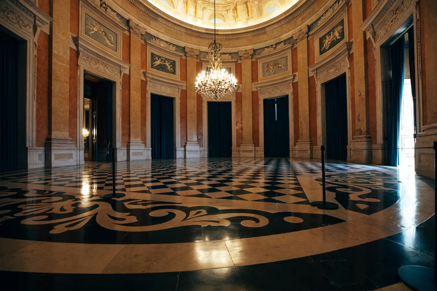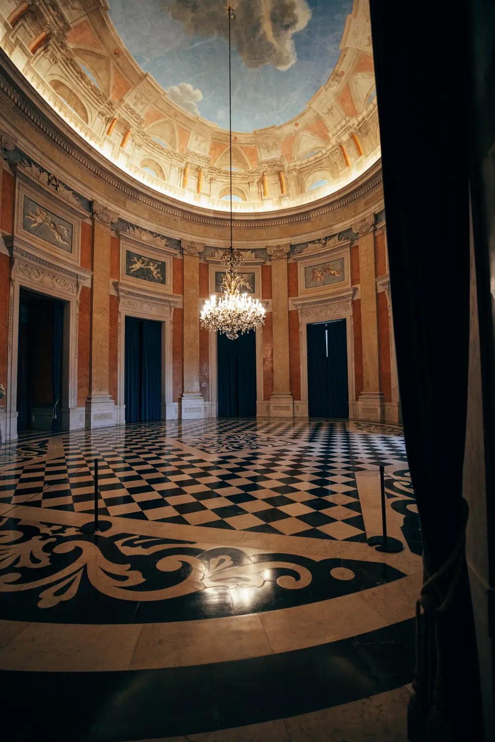 Round room, unique and exclusive at a national level. The ceiling features a painted soft blue sky with clouds, and the geometric-patterned floor is in black and white marble. This room also has a large east-facing balcony.