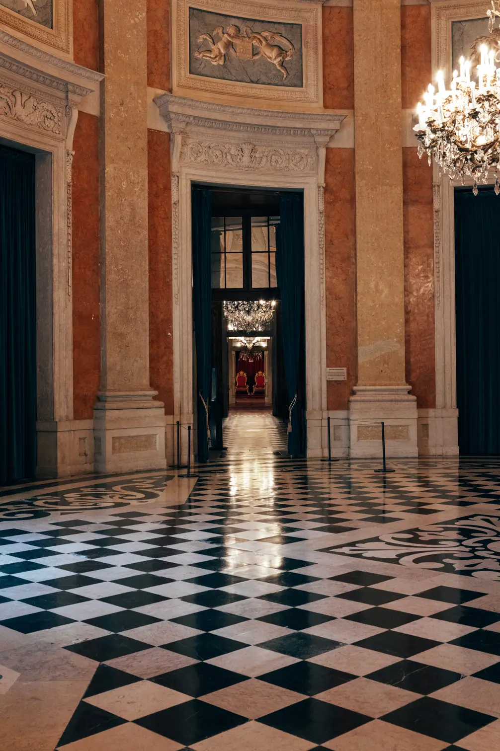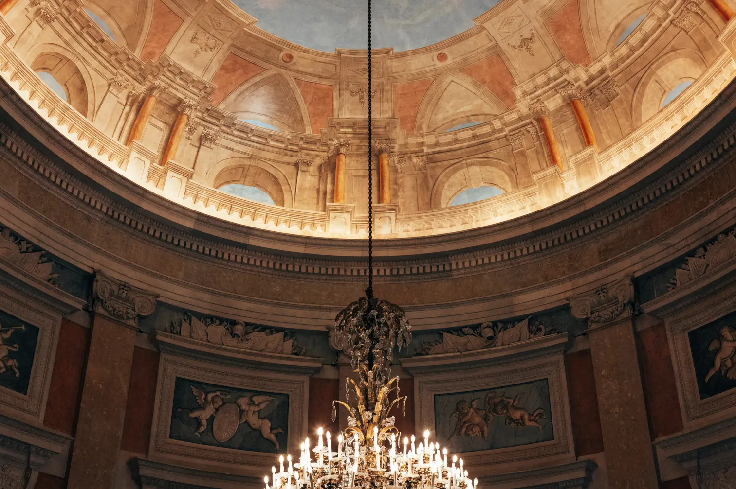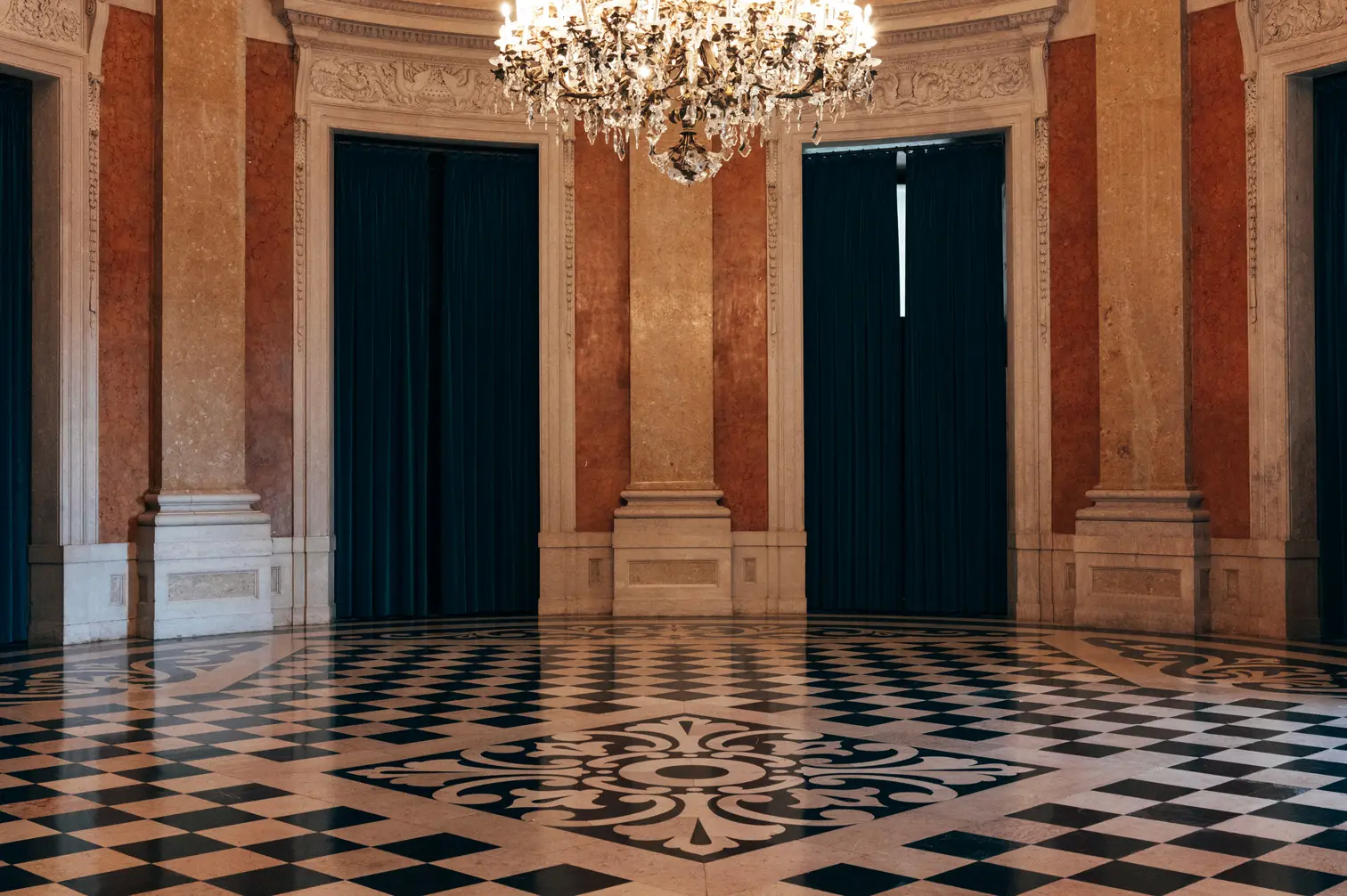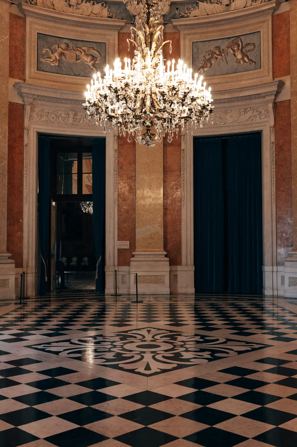 Round room, unique and exclusive at a national level. The ceiling features a painted soft blue sky with clouds, and the geometric-patterned floor is in black and white marble. This room also has a large east-facing balcony.