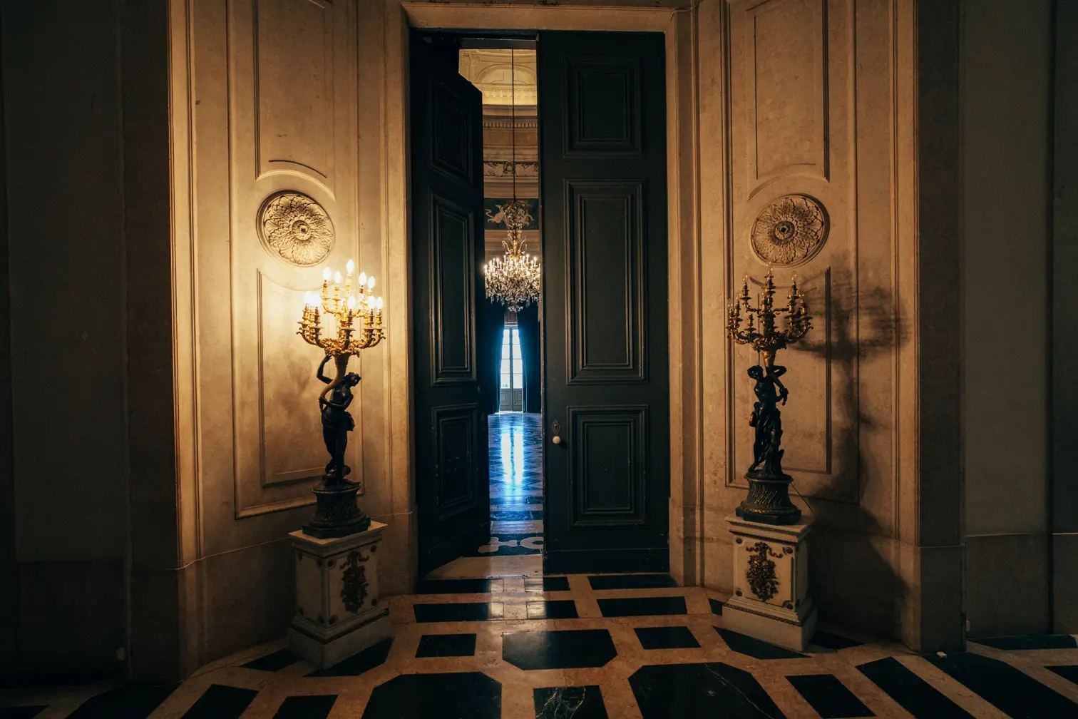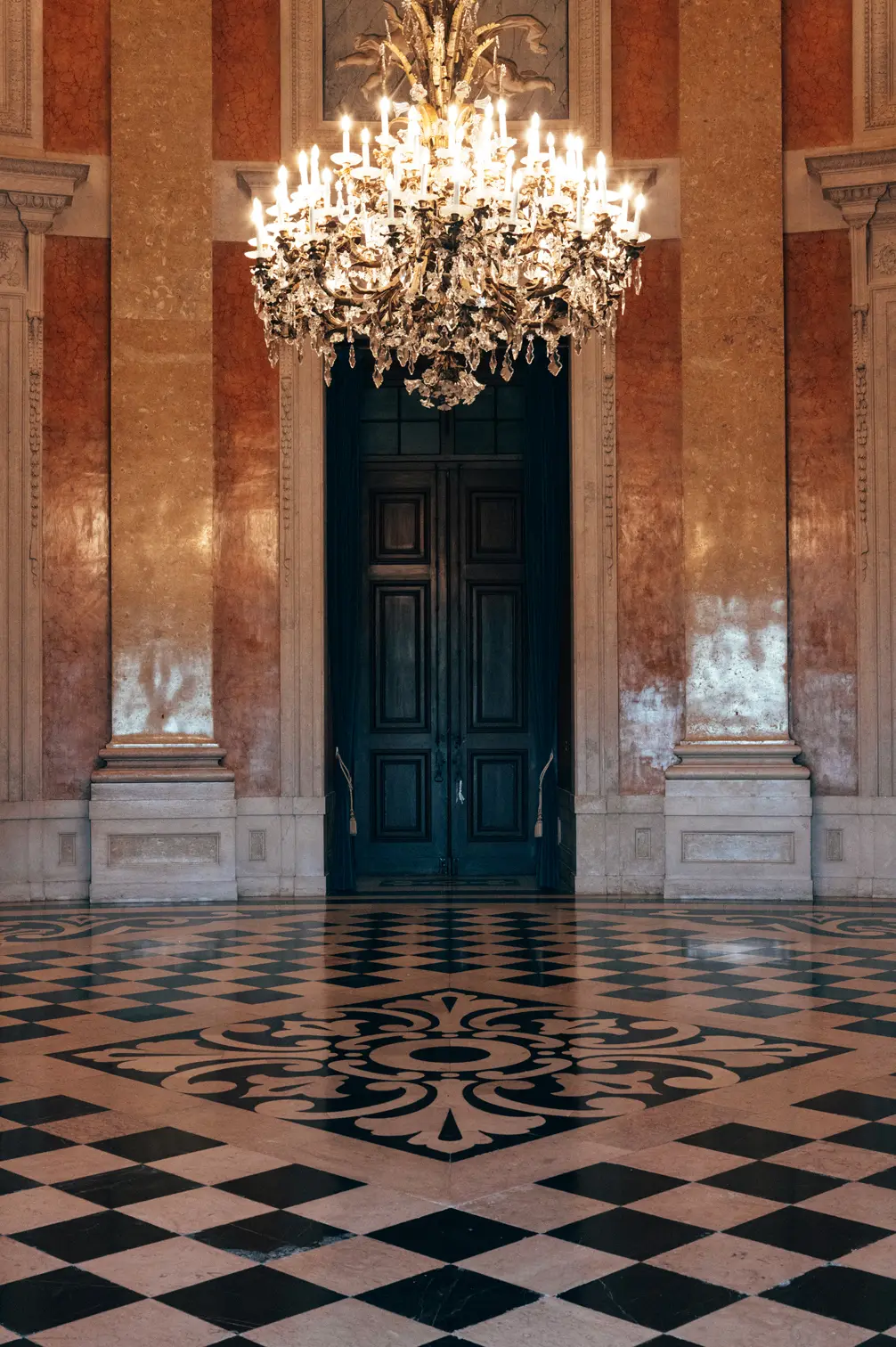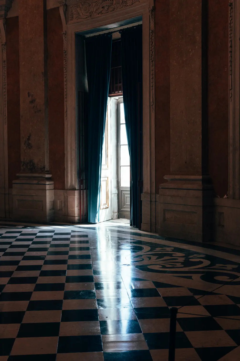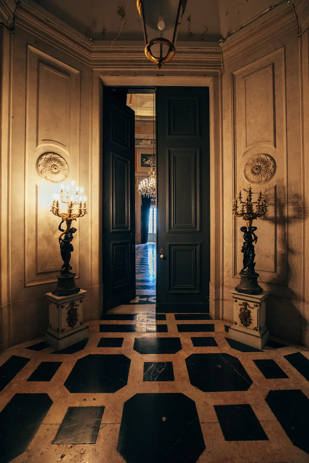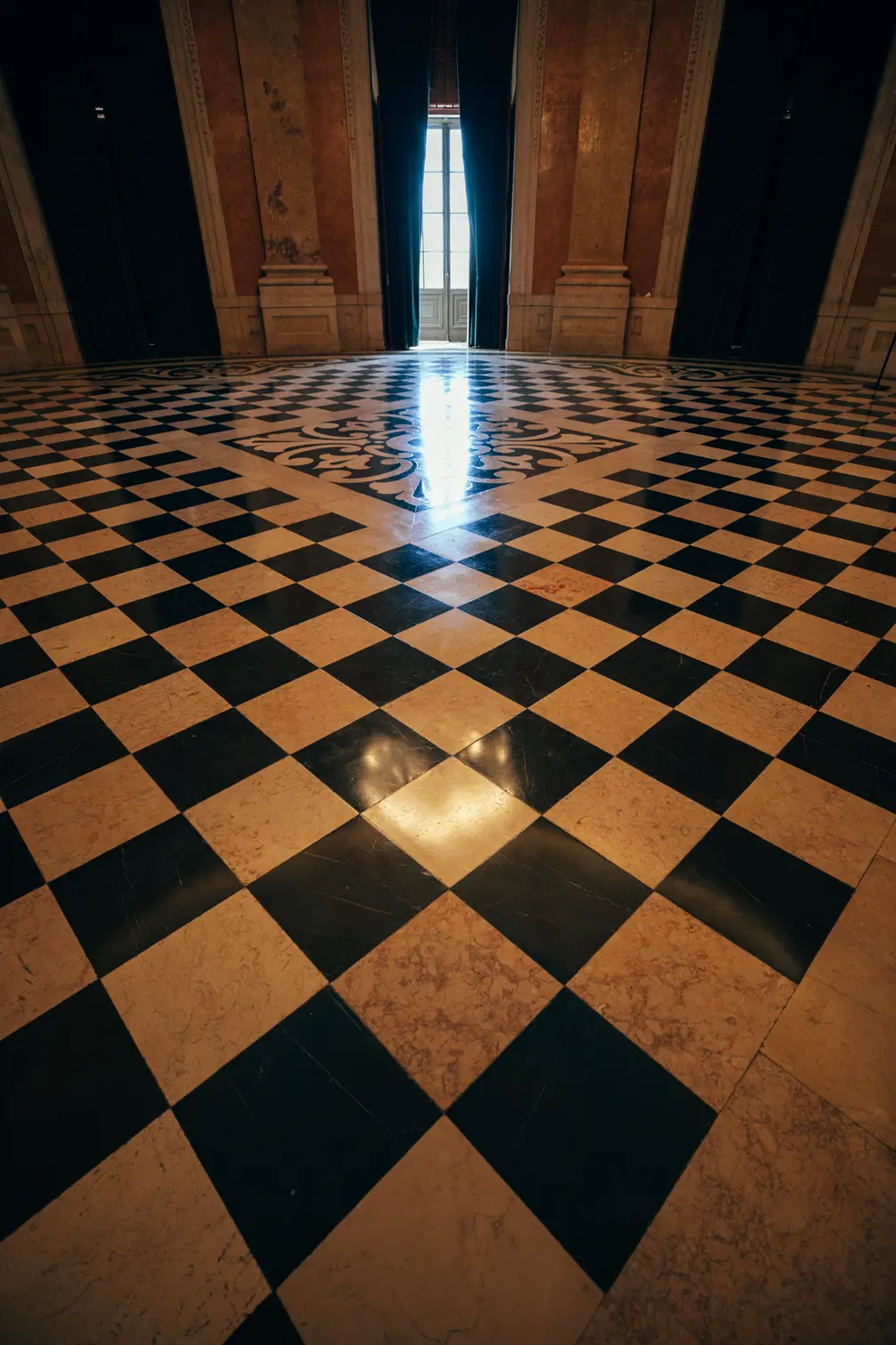 Round room, unique and exclusive at a national level. The ceiling features a painted soft blue sky with clouds, and the geometric-patterned floor is in black and white marble. This room also has a large east-facing balcony.