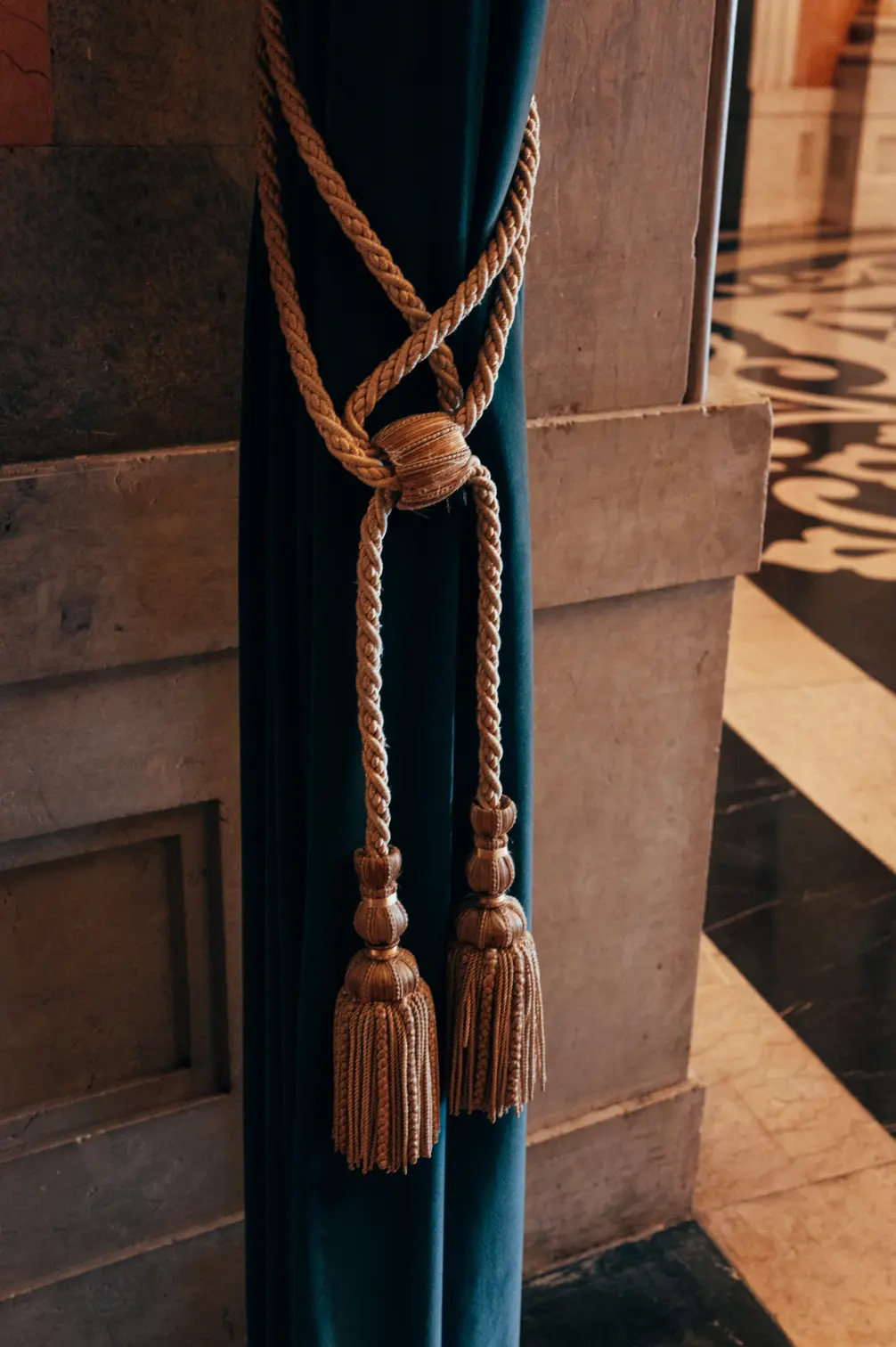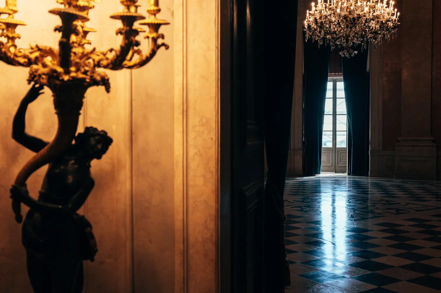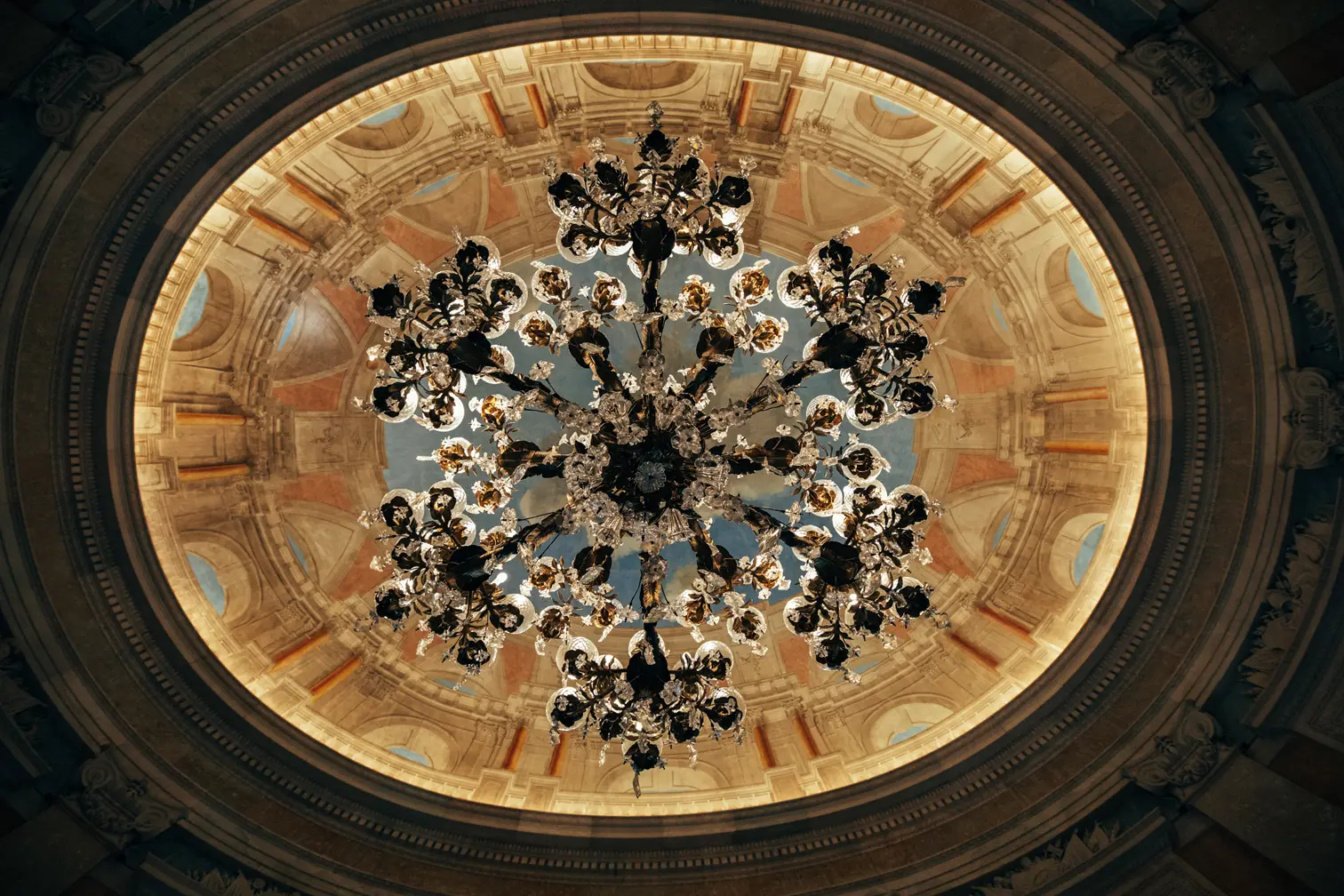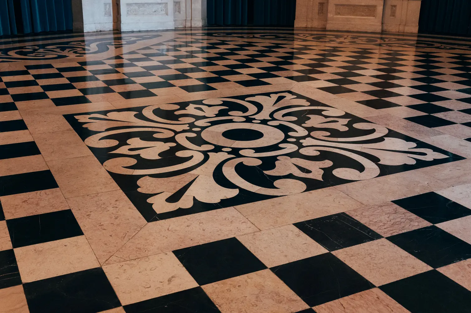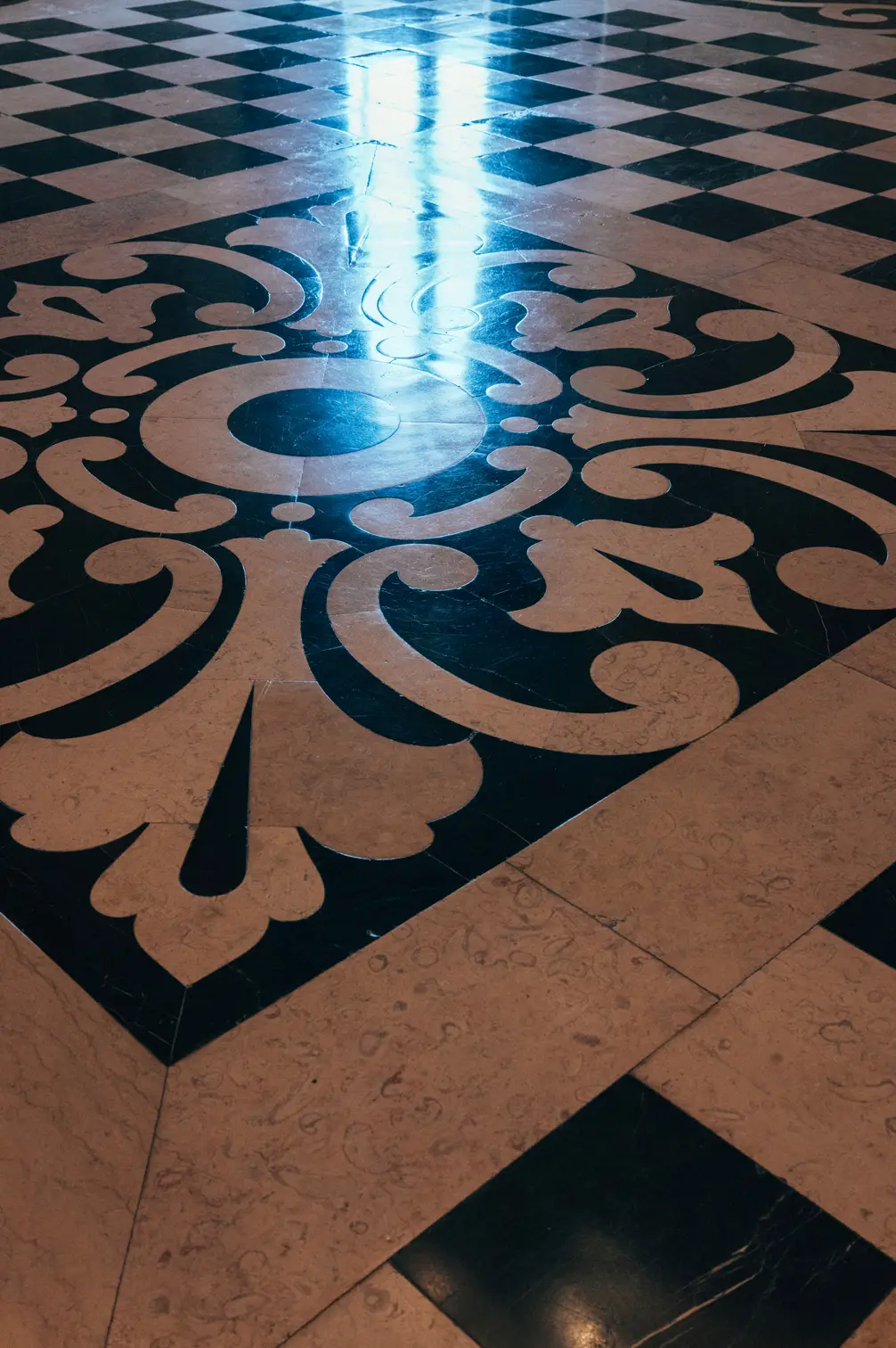 Round room, unique and exclusive at a national level. The ceiling features a painted soft blue sky with clouds, and the geometric-patterned floor is in black and white marble. This room also has a large east-facing balcony.