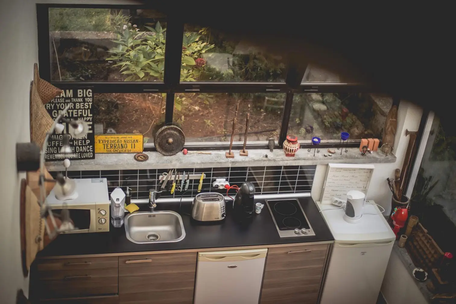 Um jardim sublime, salas amplas, lareira suspensa, cozinha vermelha e paredes em pedra