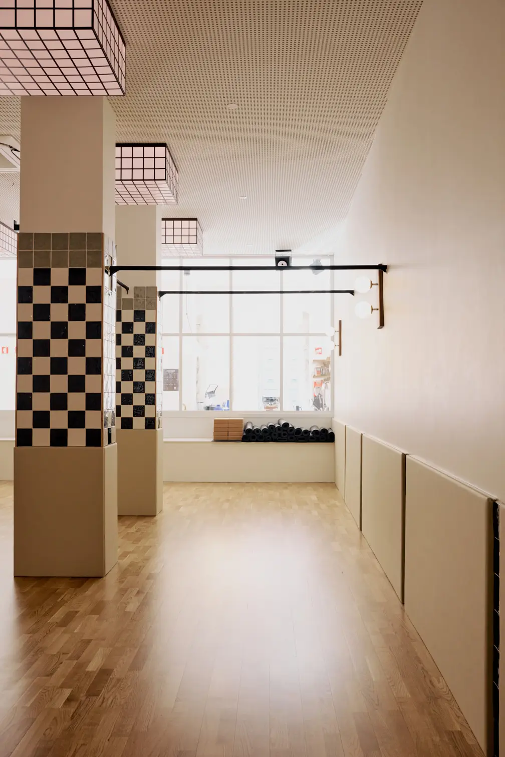 Estúdio contemporâneo com balneários e casas de banho coloridas