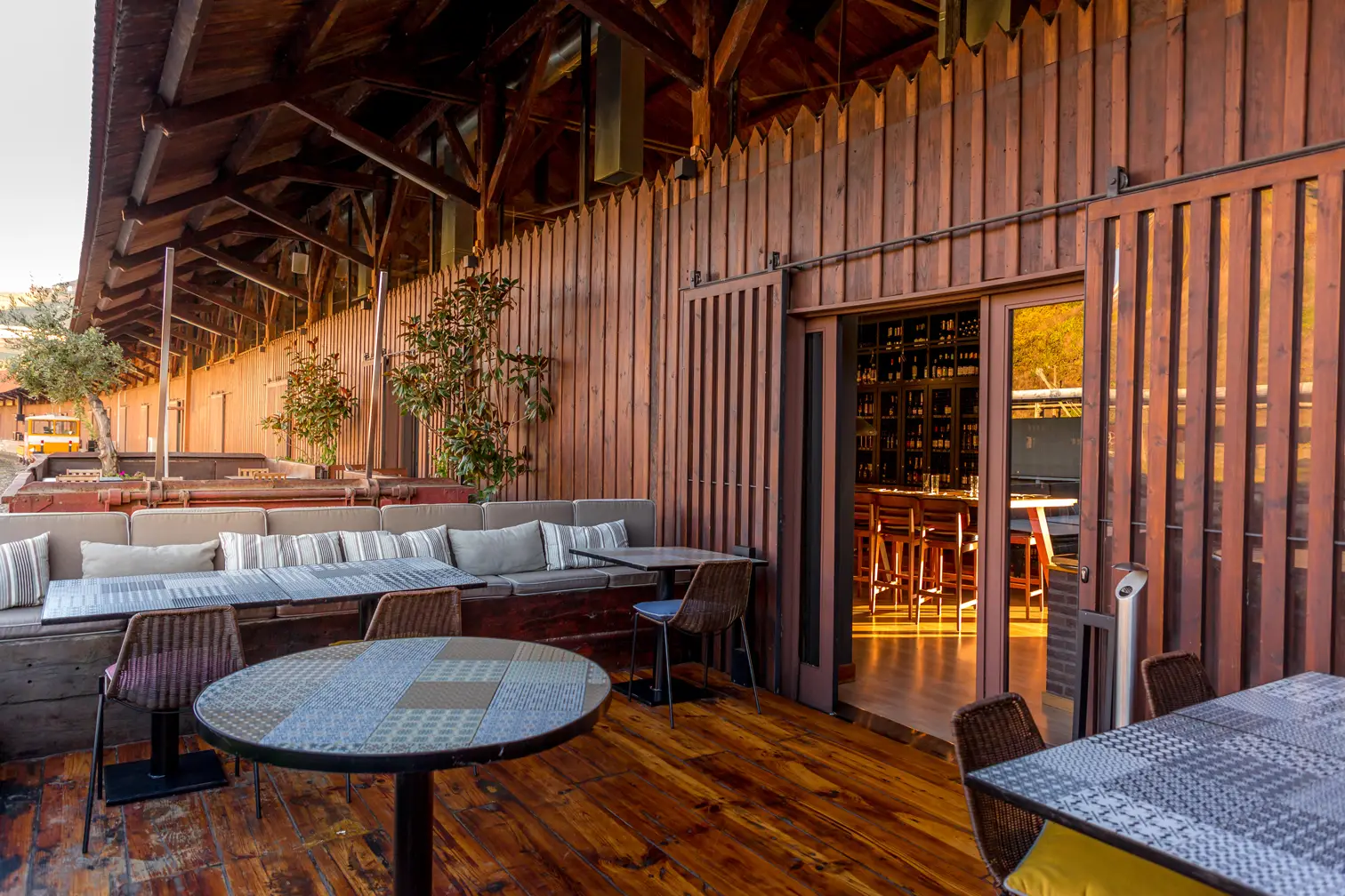Restaurante com dois pisos e zona exterior junto à linha de comboio — um setting ideal para filmagens. Destacam-se as paredes com garrafeiras do chão ao teto, o pé-direito alto e a lareira no piso térreo, bem como o ambiente intimista que caracteriza todo o espaço.