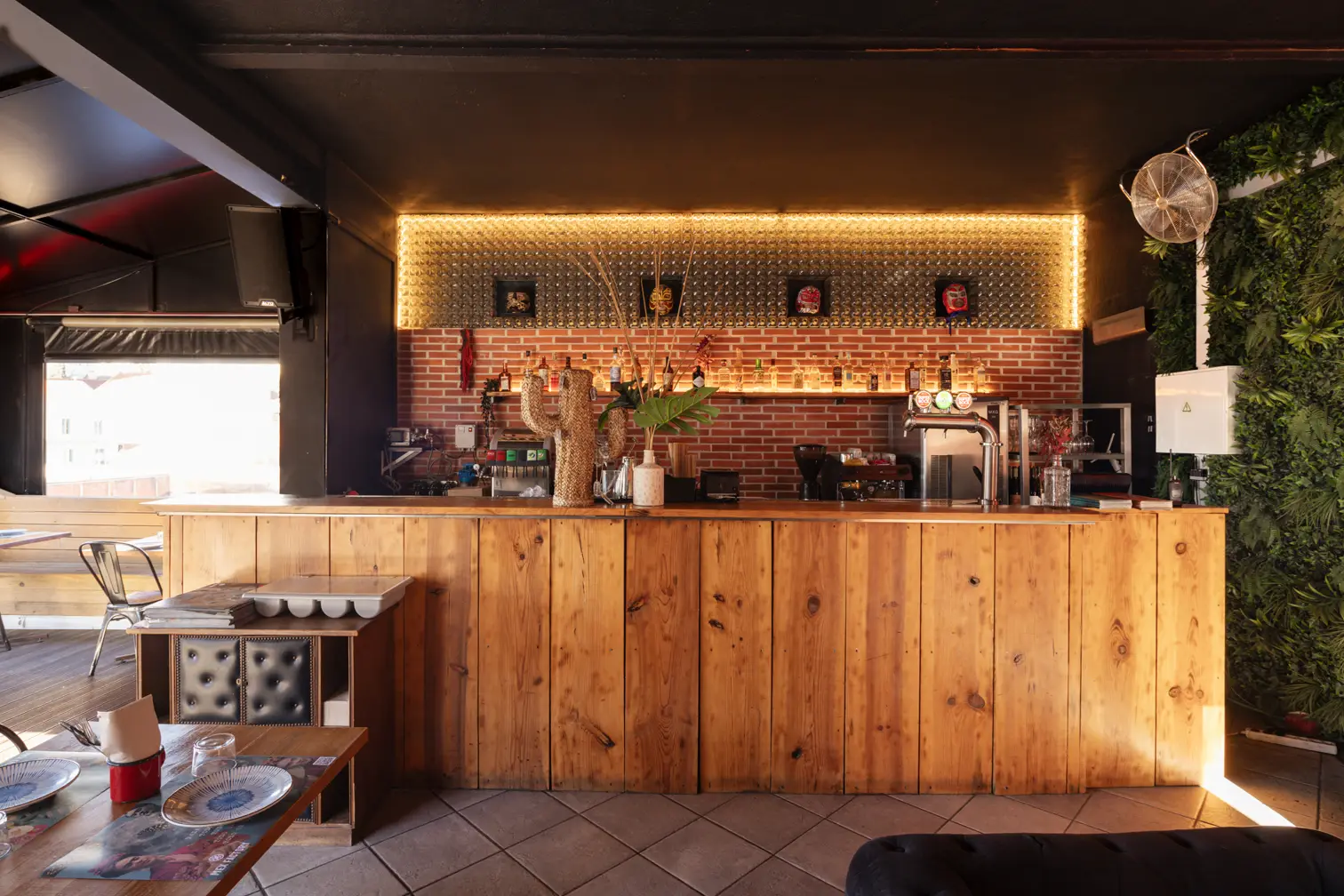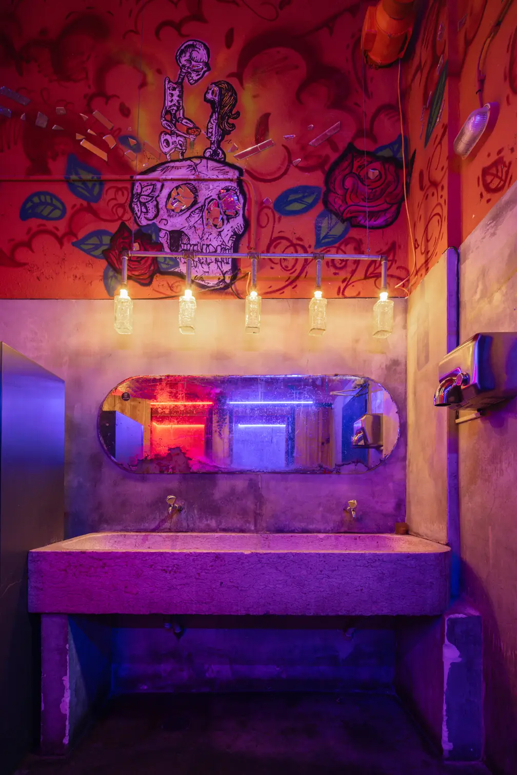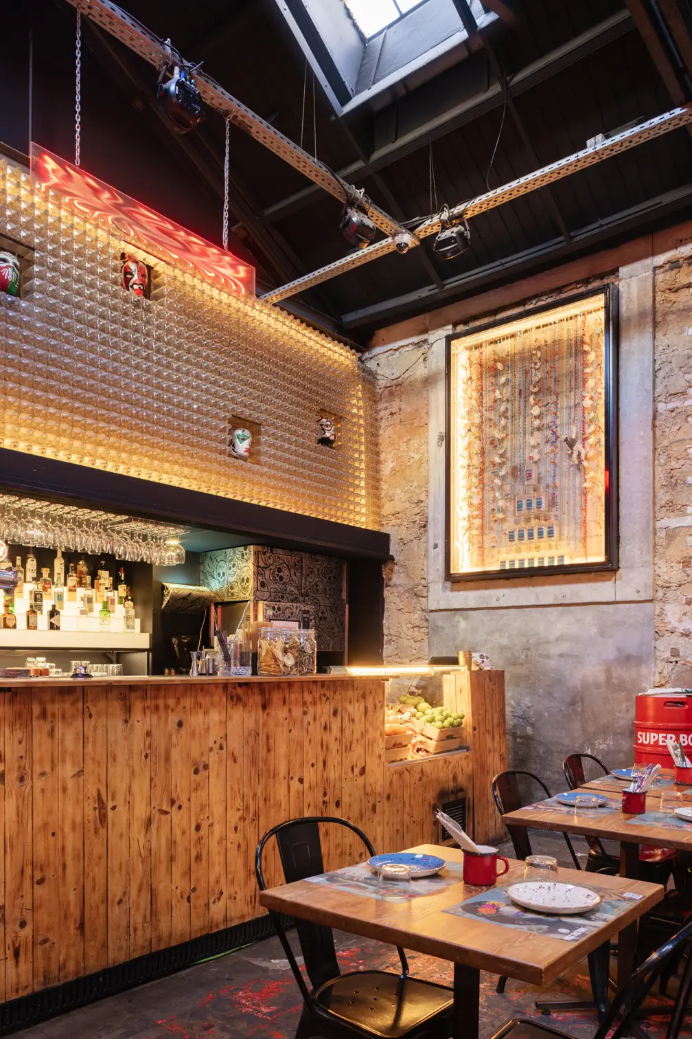 Restaurante de estilo industrial com tijolo exposto, luzes led e graffitis