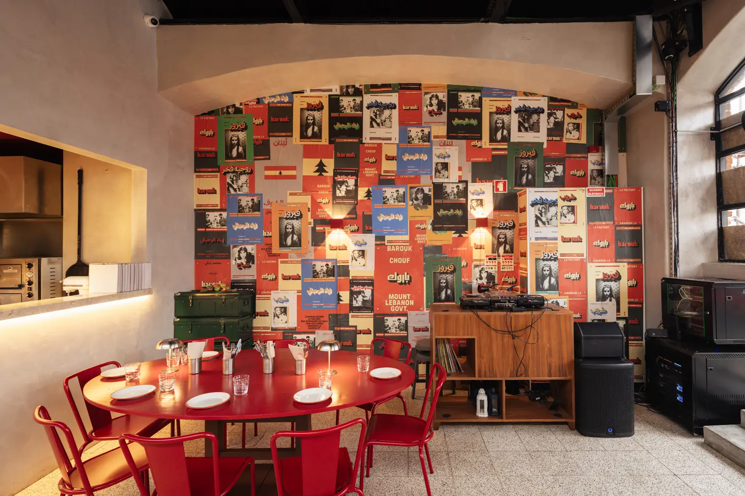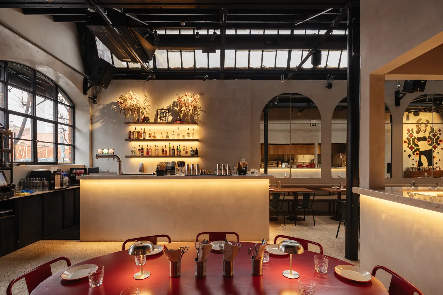 Restaurante de estilo industrial com tijolo exposto, luzes led e graffitis